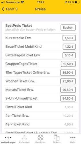 - Preisoptimierung auf Kurz-, Einzel-, Tages-, Wochen-, 10er-Tages-, Monats- und 9-Uhr-Ticket-Basis