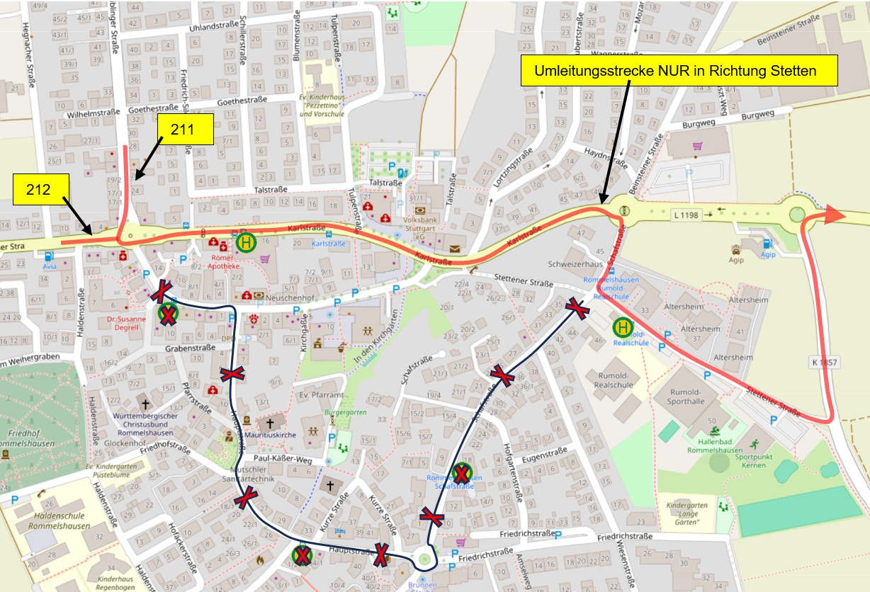 Aufgrund des Krämermarkt am 19.10.25 ab 06:00 Uhr bis Betriebsende müssen die Linien 211 und 212 in Fahrtrichtung Stetten umgeleitet werden.