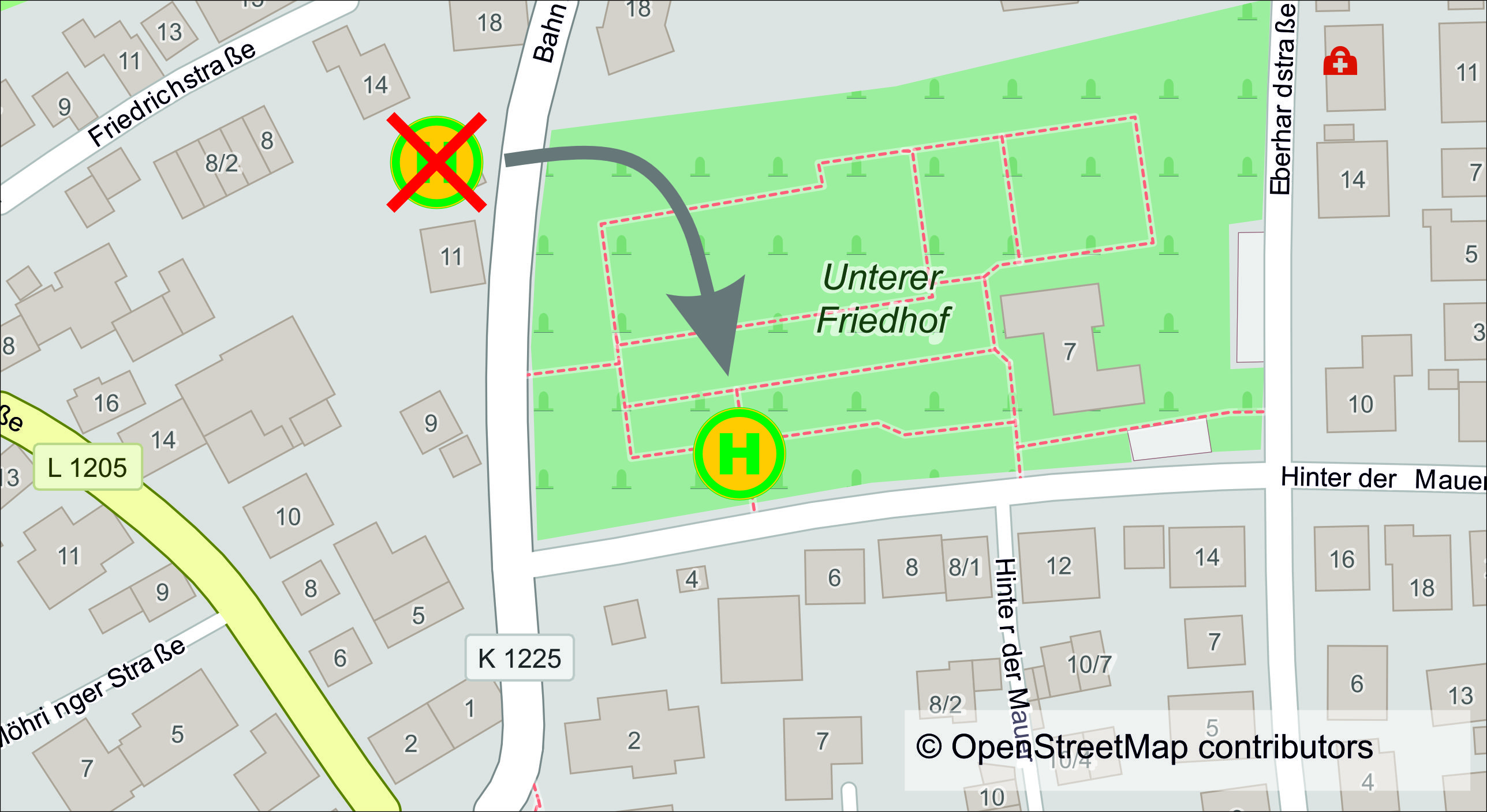 - In der Straße Hinter der Mauer, Höhe Friedhof.