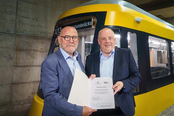 Landesverkehrsminister Winfried Hermann (links) übergab den Förderbescheid an den Technischen Vorstand der SSB, Thomas Moser.
