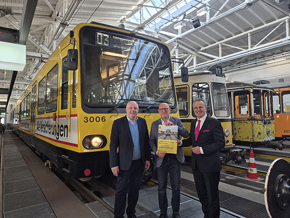 Für die Übergabe des Förderbescheids trafen sich die Gäste in einem historischen Erprobungsfahrzeug aus der Phase der Vorüberlegungen für das Stuttgarter Stadtbahnsystem. Der gelbe Prototyp mit der Nummer 3006 ist das letzte verbliebene von ursprünglich drei Versuchsfahrzeugen. Er ist historischer Zeuge für die Vision Stadtbahn Stuttgart, die dann ein alltäglich spürbarer Erfolg für die Stadt geworden ist. Auf der Grundlage dieser Versuchsreihe ist die erste Stadtbahnbaureihe S-DT8.4 entstanden, die seit 1985 in Stuttgart bis heute sicher und zuverlässig unterwegs ist – nicht nur, wie ursprünglich auf der Linie U3, sondern auf allen Stadtbahnlinien. „Seit 1985 läuft im Stadtbahnsystem Stuttgarts die Zeit für die Infrastruktur und die Fahrzeuge. Die Förderung ermöglicht es uns, die schon heute über 40 Jahre alten Fahrzeuge zu ersetzen und zeitgemäße neue einzusetzen. So können wir unseren Fahrgästen in Stuttgart auch in Zukunft den starken und verlässlichen Nahverkehr bieten, der diese Stadt mit ausmacht“ sagt der Technische Vorstand und Vorstandssprecher der SSB Thomas Moser mit nachdrücklichem Dank für die stete Unterstützung der SSB.
